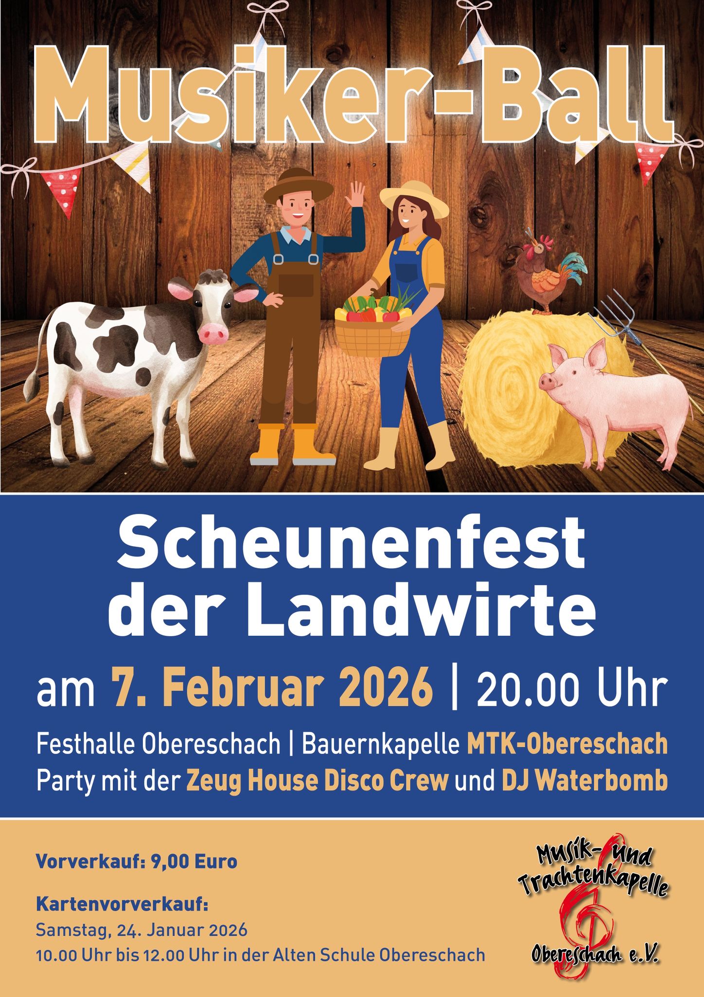 Am Samstag, 07. Februar 2026 heißt es wieder: Bühne frei für den legendären Musikerball der Musik- und Trachtenkapelle Obereschach! Die Turn- und Festhalle Obereschach verwandelt sich in eine brodelnde Fasnet-Scheune – mit jeder Menge Musik, starken Showacts, närrischem Programm und guter Laune!